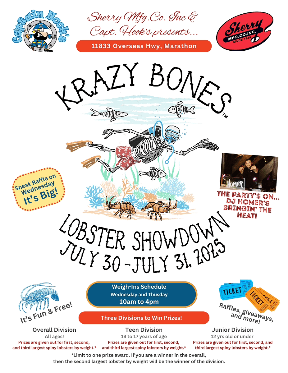 Get ready for the ultimate Lobster Mini Season tradition! The 2025 Krazy Bones Lobster Showdown returns to Captain Hook’s in Marathon on July 30–31 with two days of lobster hunting, weigh-ins, raffles, and live music. Whether you’re competing for the biggest bug or just soaking up the party vibes with DJ Homer, this family-friendly event is free, fun, and open to all ages.